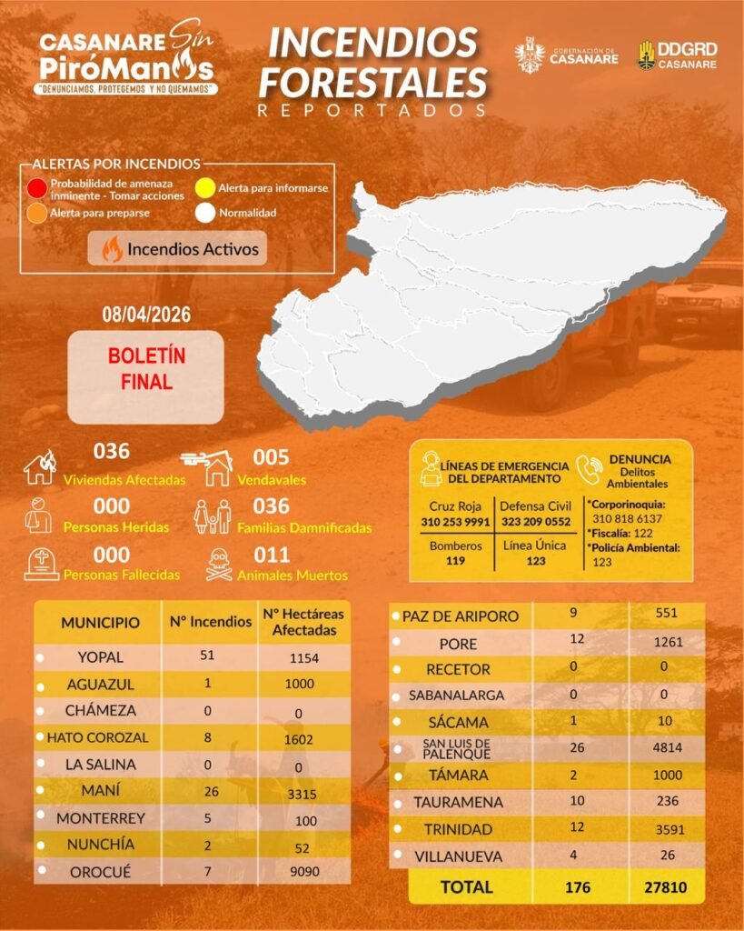 Un total de 183 emergencias, 165 incendios de cobertura vegetal, 27.810 hectáreas afectadas y once animales muertos deja como balance la temporada seca en Casanare, según el reporte entregado por la Gobernación a través de Gestión del Riesgo de Desastres de Casanare, en articulación con alcaldías y organismos de socorro.