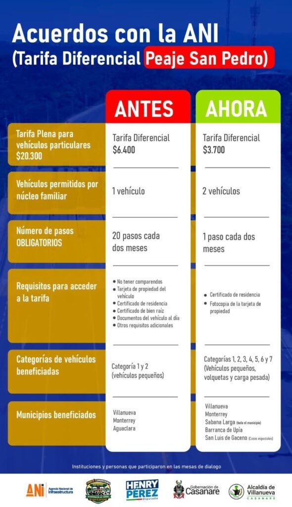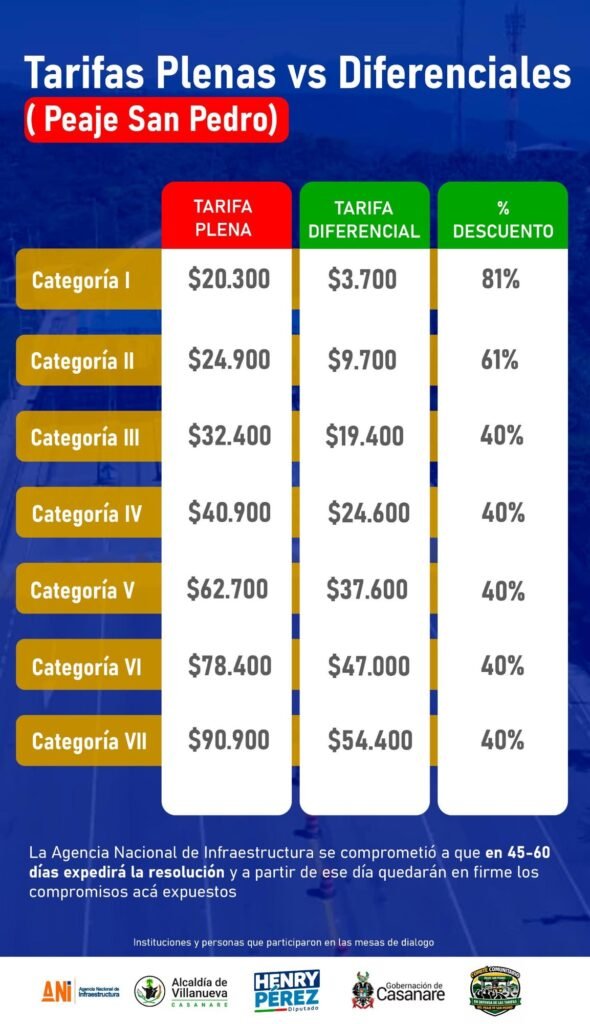 Los acuerdos alcanzados en el peaje San Pedro contemplan una reducción en la tarifa diferencial, la ampliación de los vehículos y municipios beneficiados y la simplificación de los requisitos para acceder a estos descuentos, los cuales deberán implementarse en un plazo de entre 45 y 60 días, según el compromiso asumido por la Agencia Nacional de Infraestructura (ANI).