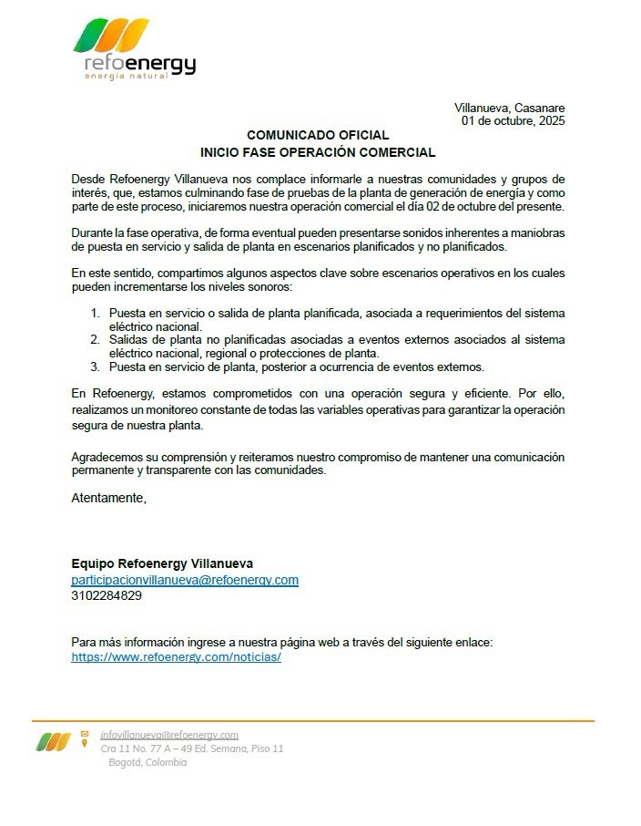 Refoenergy Villanueva informó que, tras finalizar la fase de pruebas de su planta de generación, hoy comenzará su operación comercial. La empresa señaló que durante la fase operativa pueden presentarse sonidos relacionados con maniobras de puesta en servicio o salida de planta.