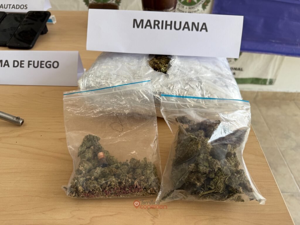 Durante el procedimiento, los uniformados hallaron 100 gramos de cocaína y sus derivados, equivalentes a 200 dosis, con un valor estimado de 5 millones de pesos. También encontraron 1.100 gramos de marihuana, equivalentes a 3.300 dosis, avaluadas en 9 millones de pesos. Además, fueron incautados un revólver calibre 22, cinco teléfonos celulares y elementos utilizados para la dosificación de estupefacientes.