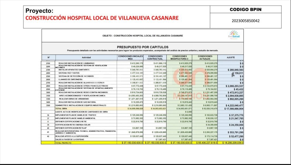 La solicitud adicional del contratista corresponde al 49,14% del valor total del contrato. Incluye ajustes por mayores cantidades de obra, actividades no previstas, y la incorporación de 198 nuevos ítems. Entre estos se encuentran la instalación de un sistema fotovoltaico y la compra de equipos biomédicos, propuestas que superan los $5.000 millones y se espera su evaluación por parte de la Gobernación de Casanare.