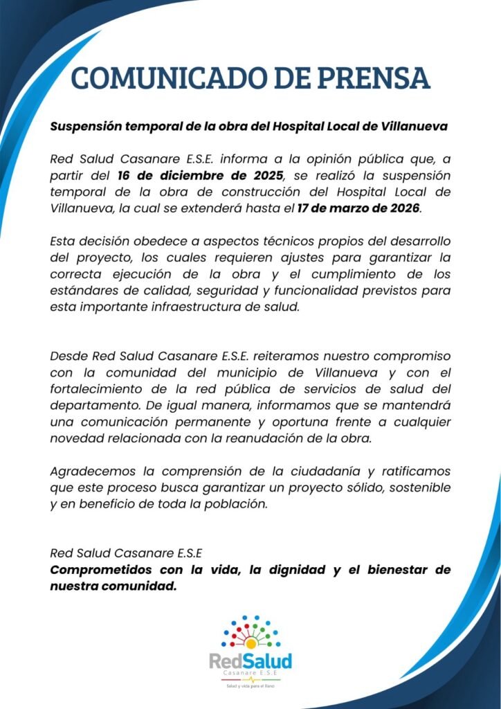 La pausa en la obra genera inquietudes en el municipio, dado que el hospital está llamado a fortalecer la capacidad de atención en salud de la población. Sin embargo, no se ha precisado cuál será el impacto de esta suspensión sobre los tiempos de entrega ni sobre la puesta en funcionamiento del centro asistencial.
