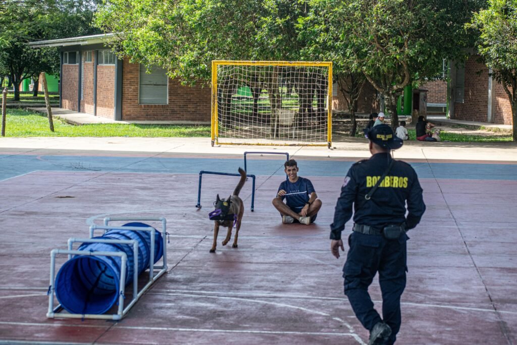 Después del recorrido, el Cuerpo de Bomberos Voluntarios de Villanueva realizó una demostración con su equipo canino en el polideportivo del colegio. Los ejercicios incluyeron direccionamiento, tránsito por túnel y maniobras básicas utilizadas en entrenamientos para procesos de certificación. Según la institución, la actividad surgió tras una solicitud de acompañamiento y se aprovechó para fortalecer prácticas que deben presentar en evaluaciones formales.