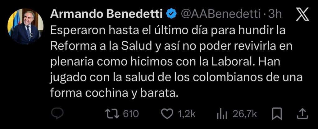 Horas antes de la votación, el ministro del Interior, Armando Benedetti, había advertido que retomar el debate en el último día de la legislatura reducía las posibilidades de que el proyecto continuara su trámite. A través de su cuenta en X, el funcionario cuestionó el manejo del proceso legislativo y señaló que esta situación impedía un desenlace similar al de la reforma laboral, aprobada y sancionada en junio de este año.