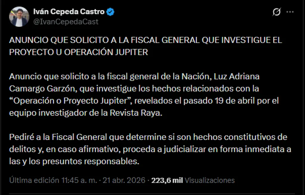 El coordinador del Proyecto Júpiter, el excanciller Jaime Bermúdez, negó los señalamientos de desinformación y posibles prácticas de constreñimiento electoral que han surgido desde distintos sectores del Gobierno frente a esta iniciativa, y aseguró que su propósito es pedagógico y no político.