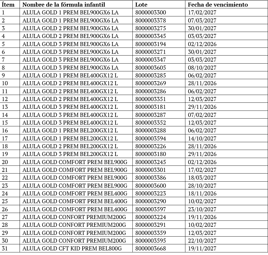 Como medida correctiva, 31 lotes de estas fórmulas infantiles serán retirados del mercado, en una contingencia que involucra presentaciones de 200, 400, 800 y 900 gramos. Las autoridades sanitarias recomendaron a padres, madres y cuidadores verificar cuidadosamente el número de lote antes de usar o suministrar estos productos.