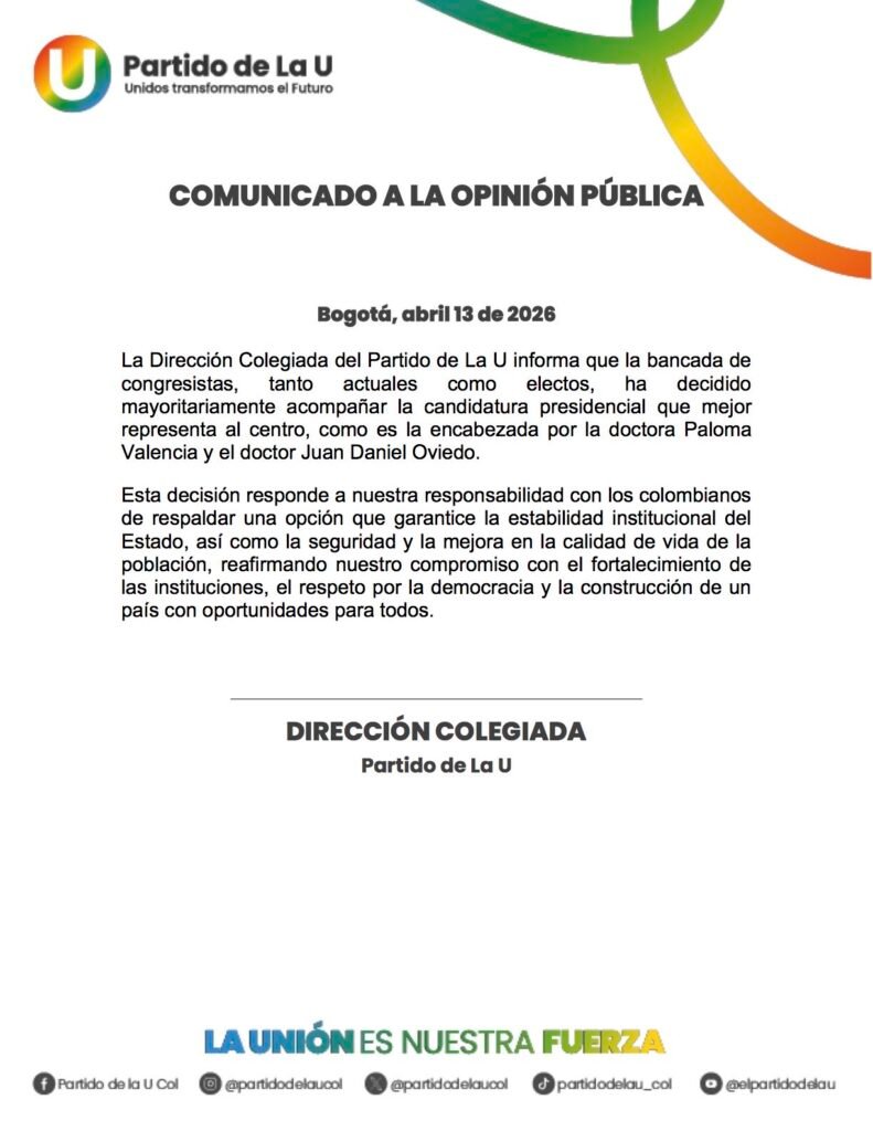 En medio de la configuración de alianzas políticas de cara a las elecciones presidenciales del 31 de mayo de 2026, el Partido de La U anunció que respaldará la candidatura encabezada por Paloma Valencia y Juan Daniel Oviedo.