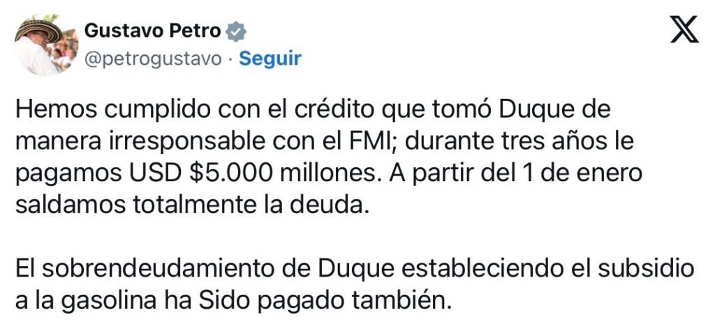 Petro aseguró que en los últimos tres años Colombia ha pagado cerca de 5.000 millones de dólares al FMI y que “a partir del 1 de enero quedará saldada la deuda”. El anuncio fue hecho a través de su cuenta de X y confirmado por el Banco de la República, que explicó que la cancelación de la Línea de Crédito Flexible obedece a la solidez de las reservas internacionales, que alcanzan los 65.500 millones de dólares.