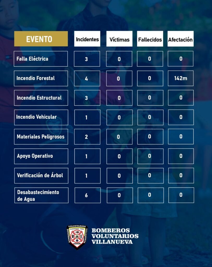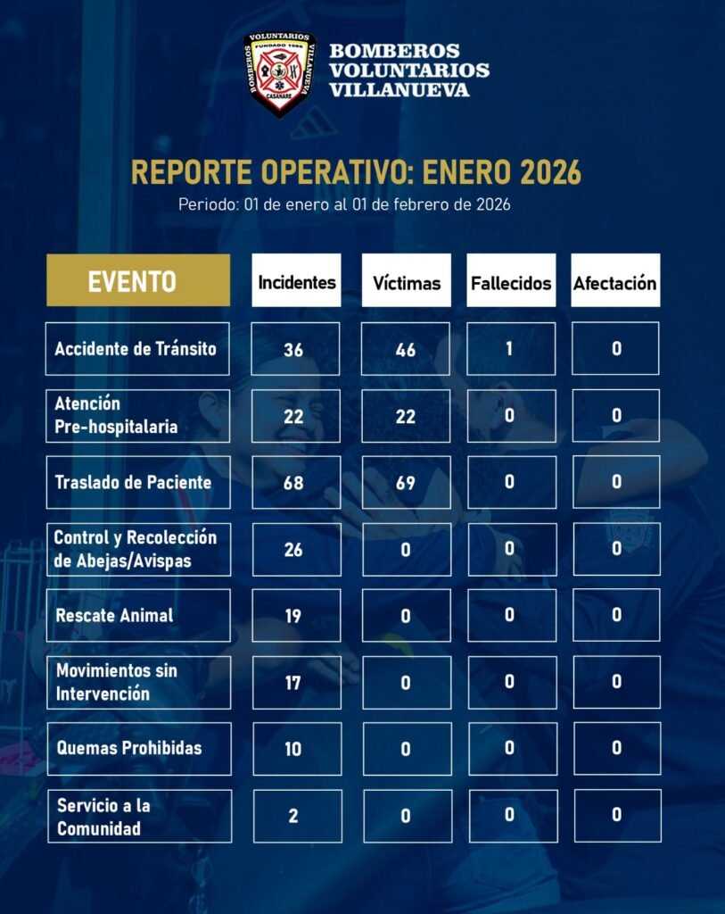 El Cuerpo de Bomberos Voluntarios de Villanueva atendió 241 incidentes durante enero de 2026, según el balance operativo entregado por la institución, correspondiente al periodo entre el 1 de enero y el 1 de febrero.